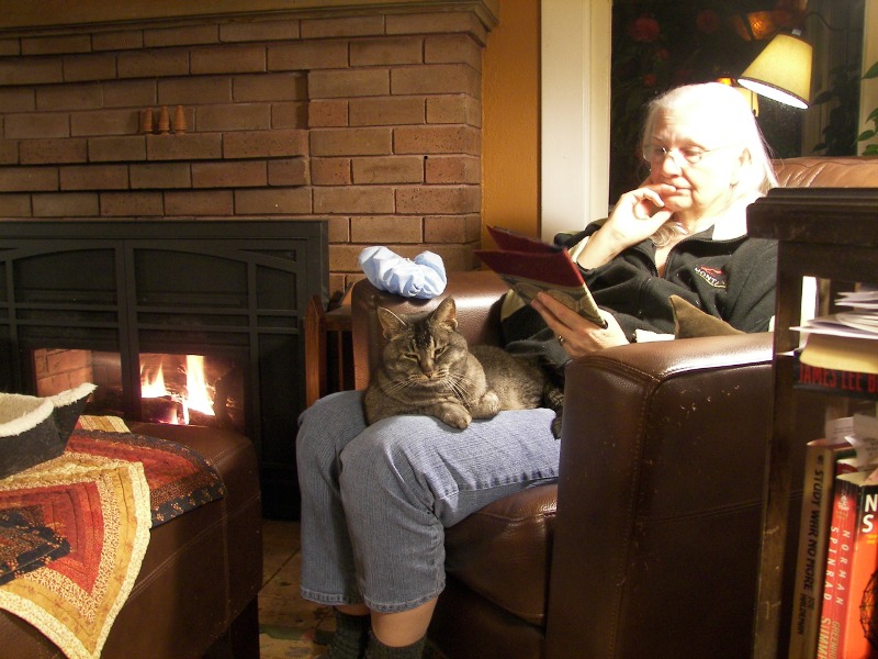 lap_time_3926 April 9, 2013 800 × 600 Spring Bicycling Season Starts with a Bang (and Concussion) Resting at home, with book, warm fire, and lap cat.