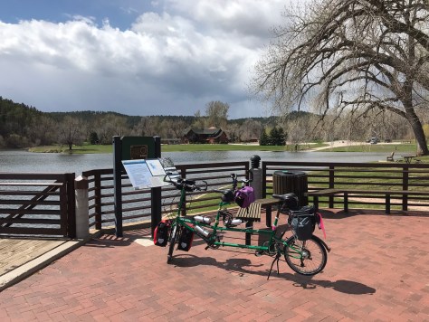 We ride back through the park and onto the old railroad grade that climbs up the west shore of Lake Couchiching. At the end of the paved trail, we chat for a while with a resident of the housing development there, a woman about our age, out walking her dog. Traveling by bicycle makes it easier to connect with the local population, and we take advantage when we can. Soon, we head back down the trail to our truck.