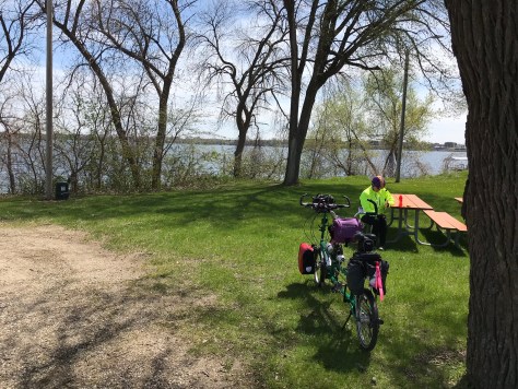 Day 24: Intending to ride today, we dress in our bicycling clothing. Pat feeds us a breakfast of strawberry crepes, and we say our good-byes and drive a short distance to the city park, where we unload the bicycle. Bath is on the Great Lakes Shore Trail, but it’s an on-road trail, with bicycle icons painted on the narrow shoulder along Highway 33, the Loyalist Parkway. The area was settled after the American Revolution by colonists loyal to the British Crown, hence the name. We ride off into a stiff 20-km/hr headwind, hard pedaling, but the combined speed keeps the mosquitoes away. Unlike the midges, the mosquitoes do bite. We ride along the shore, past a grain terminal and a huge power plant complex that supplies most of eastern Ontario, turning around 11 km down the road at St. Paul’s Church in Sandhurst, which is merely a place name: there is no town.