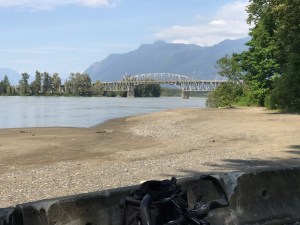 We turn around under the bridge and head back, into the wind that consistently blows up the flat valley from the Georgia Straits, 100 km away. We follow Camp River Road, a paved farm road and alternative part of the trail, along the Camp Slough, sheltered a bit by the cottonwood trees, but it’s a hard grind against the relentless wind. At last, we leave the farms and the smells that identify this one as dairy, that one, pigs, and the other one, chickens, before we even see the barns. The road becomes more residential, and has a shoulder, of sorts, that dodges around utility poles and trees. Then, we’re through neighborhoods we rode before and back to the park and our van, 31.5 km (19.5 miles), a flat ride, but hard work after a tense day traversing the mountains in a cranky old truck.
